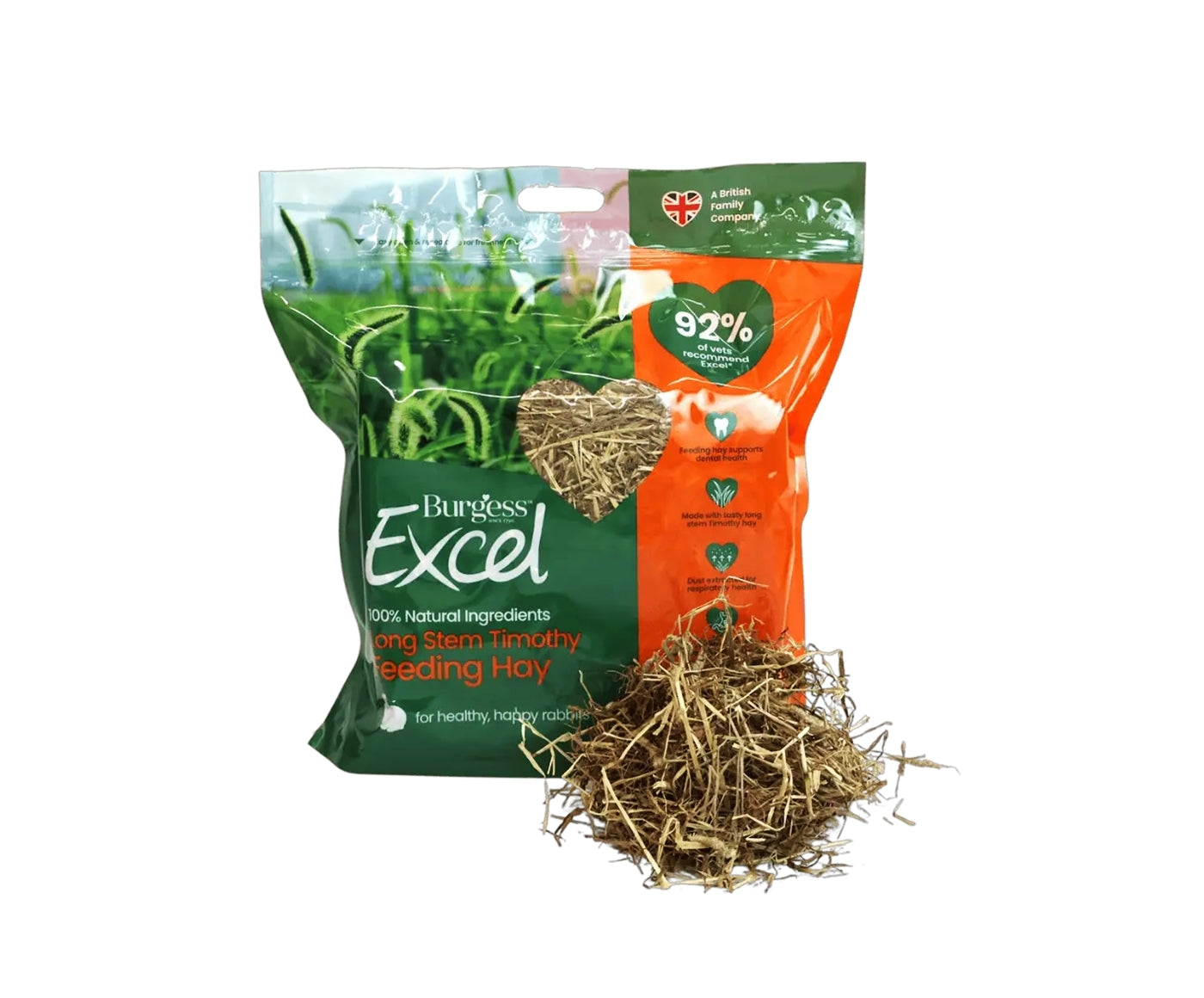 Do you know that in order to keep your rabbit’s teeth and tummies healthy they need to eat their own body size in hay every day? That’s a lot of grass and hay so it needs to be good! Bedding hay is good to sleep on but lacks the nutritional values of feeding hay. Burgess Excel Long Stem Feeding Hay is Timothy Hay grown on a farm in Yorkshire, cut at the right time and dried within 48 hours. It is high in fibre which aids digestion, whilst the long stems of hay satisfy both chewing for dental health and natural foraging giving rabbits the emotional enrichment they need. It also comes in a resealable bag so there’s less mess and it’s nice and fresh right down to the last tasty stalk!