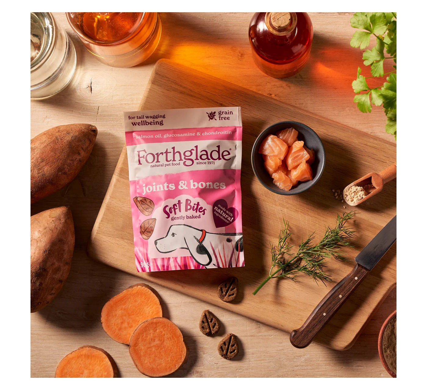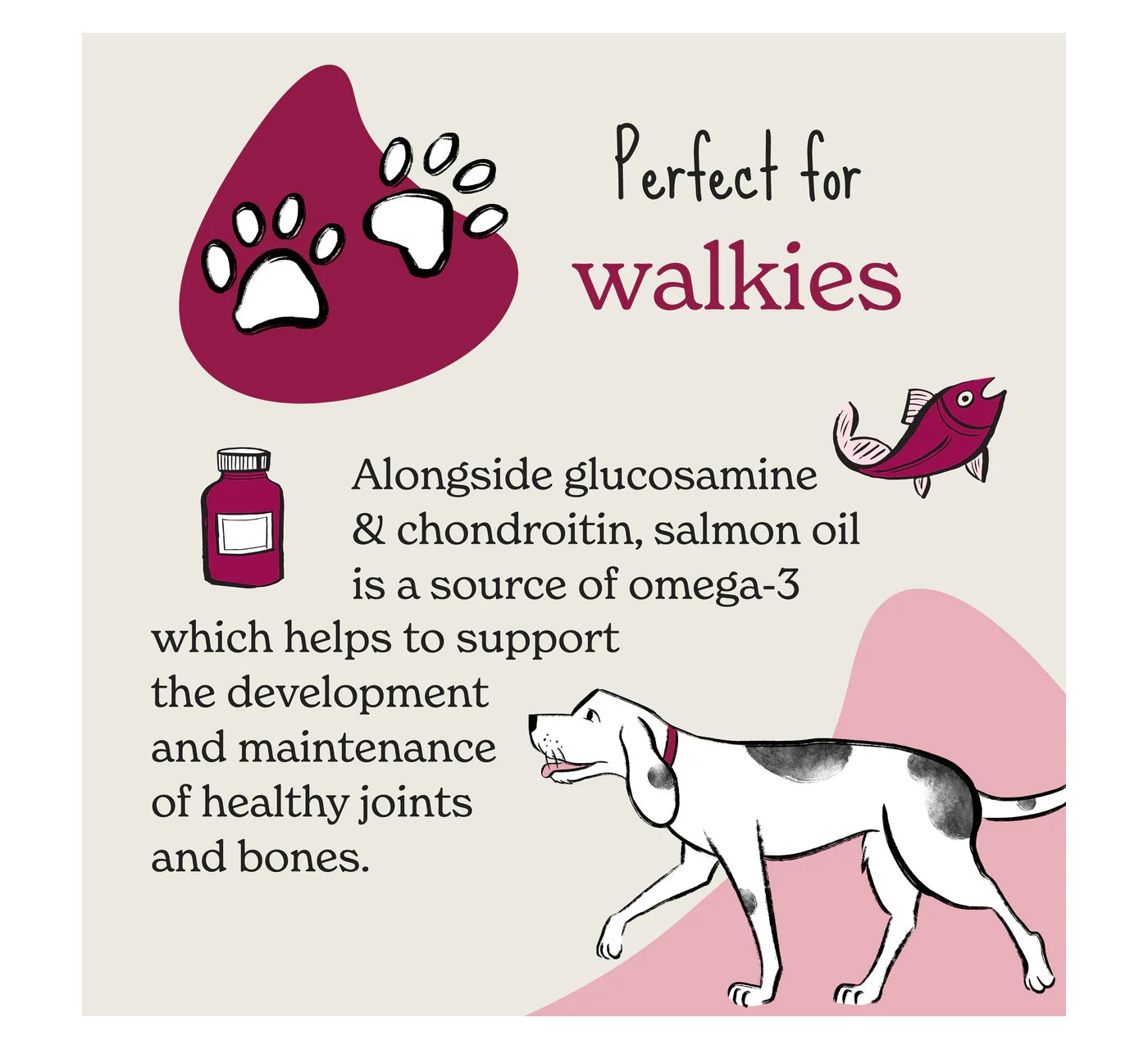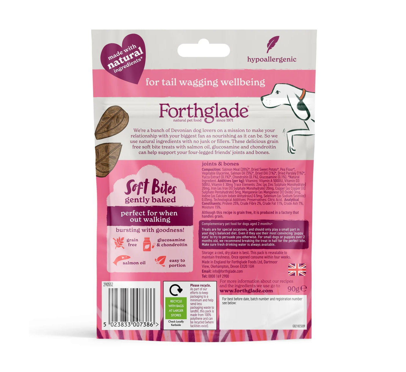 These delicious grain free soft bite treats with salmon oil are perfect for when out walking. Alongside glucosamine and chondroitin, salmon oil is a source of omega-3 which helps to support the development and maintenance of healthy joints and bones. Suitable for puppies and dogs aged 2 months+, these softer semi-moist joint treats are packed full of natural ingredients, completely free from artificial colours, flavours and preservatives. Each bag is resealable for freshness and the leaf-shaped treats are easy to break into smaller sized treats for puppy training or easy portion control.