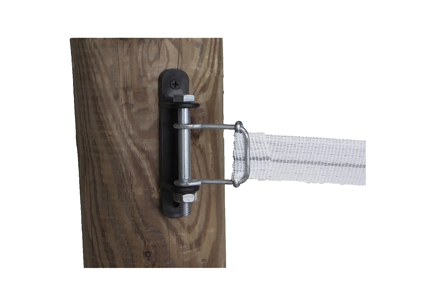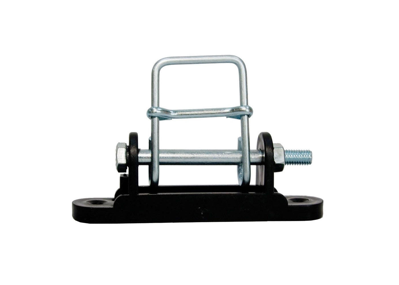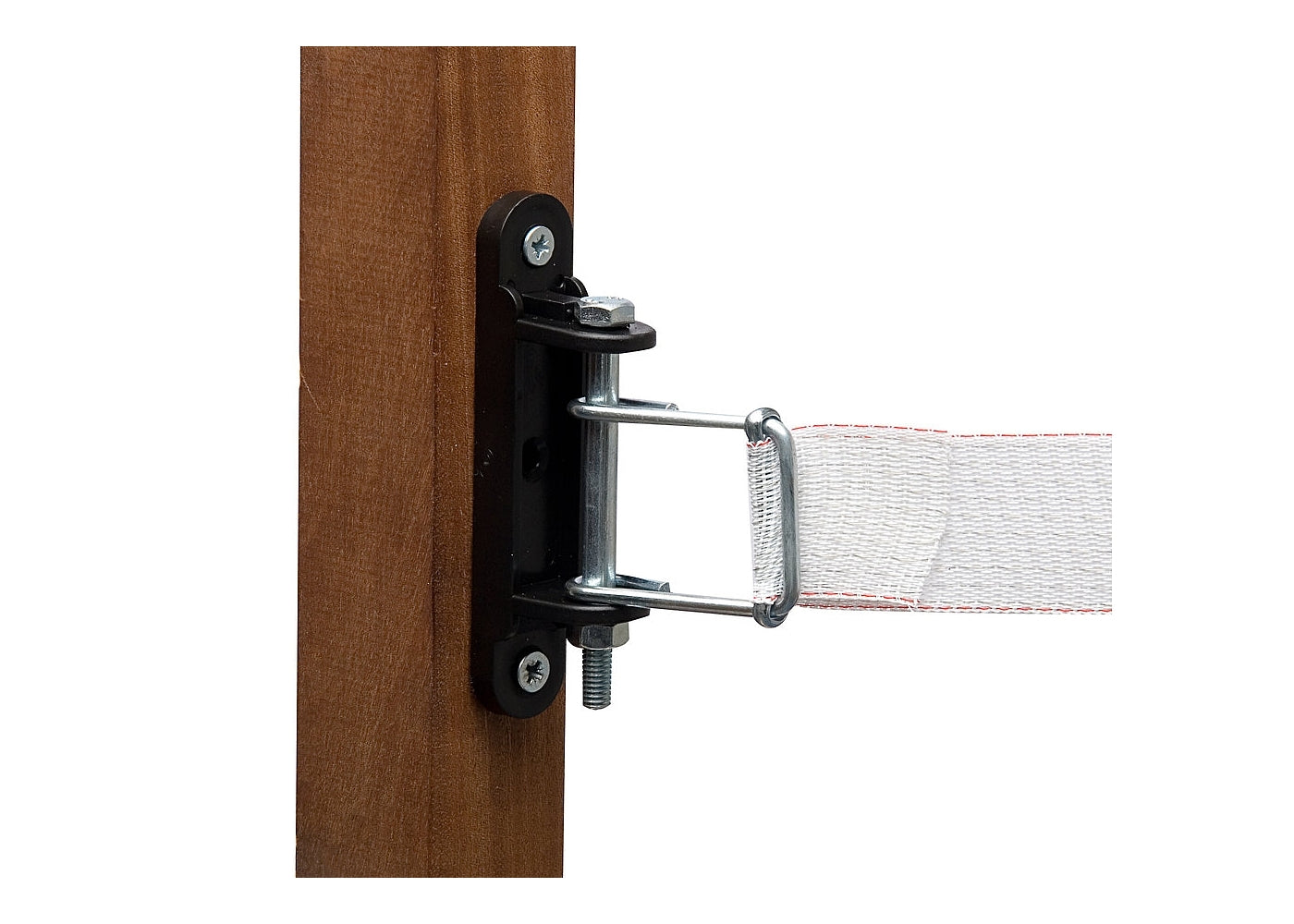 Electric fence tape up to 40mm can be tensioned and held securely at the end of the fence line with this insulator. When tensioning tape, use the buckles in a similar way to the buckles on clothing - feeding tape through on one side while at the same time hauling on the other end to tighten. Friction will effectively hold the tape in place. Even when untensioned, the conductor material cannot fall out of the tape insulator. The Hotline End Tensioning Insulator can also be used as a corner insulator when only the plastic mounting plate and bolt are used, remove the buckles (if you wish) and feed the tape around the back bar, there is no tensioning function if you do this so you will need to ensure good anchor points, or tensioning elsewhere on the fence line. *Fixing screws included.