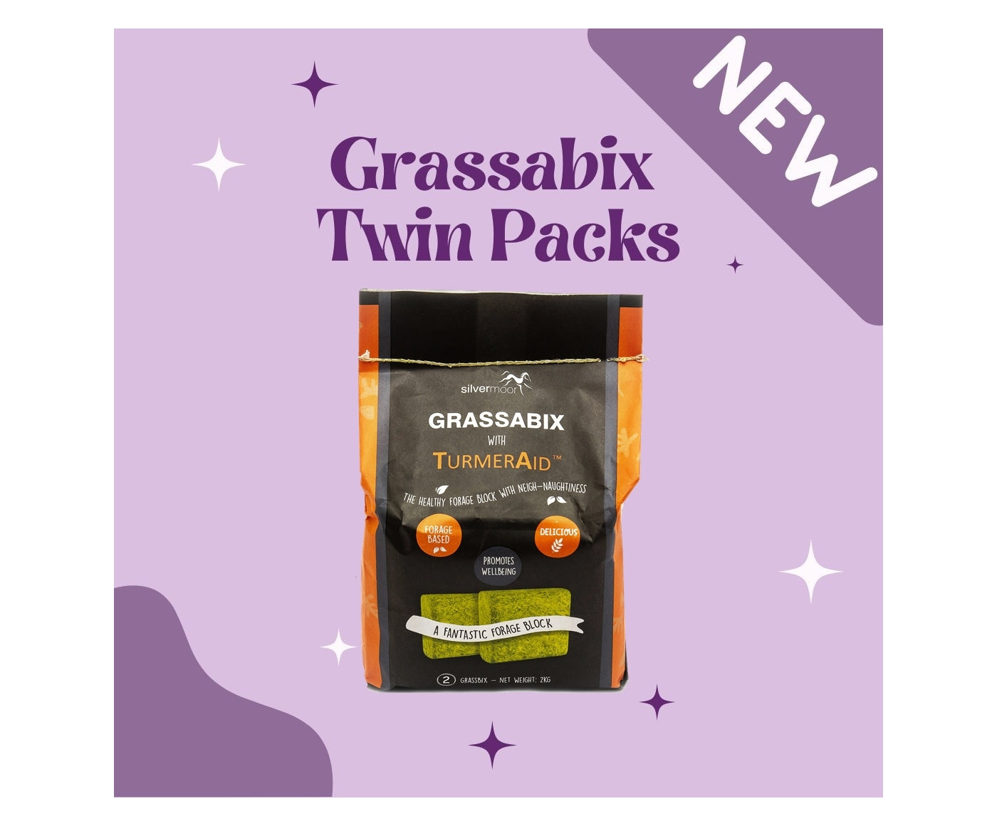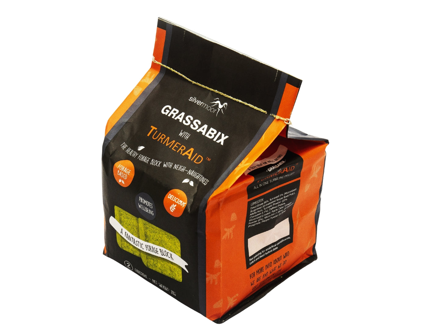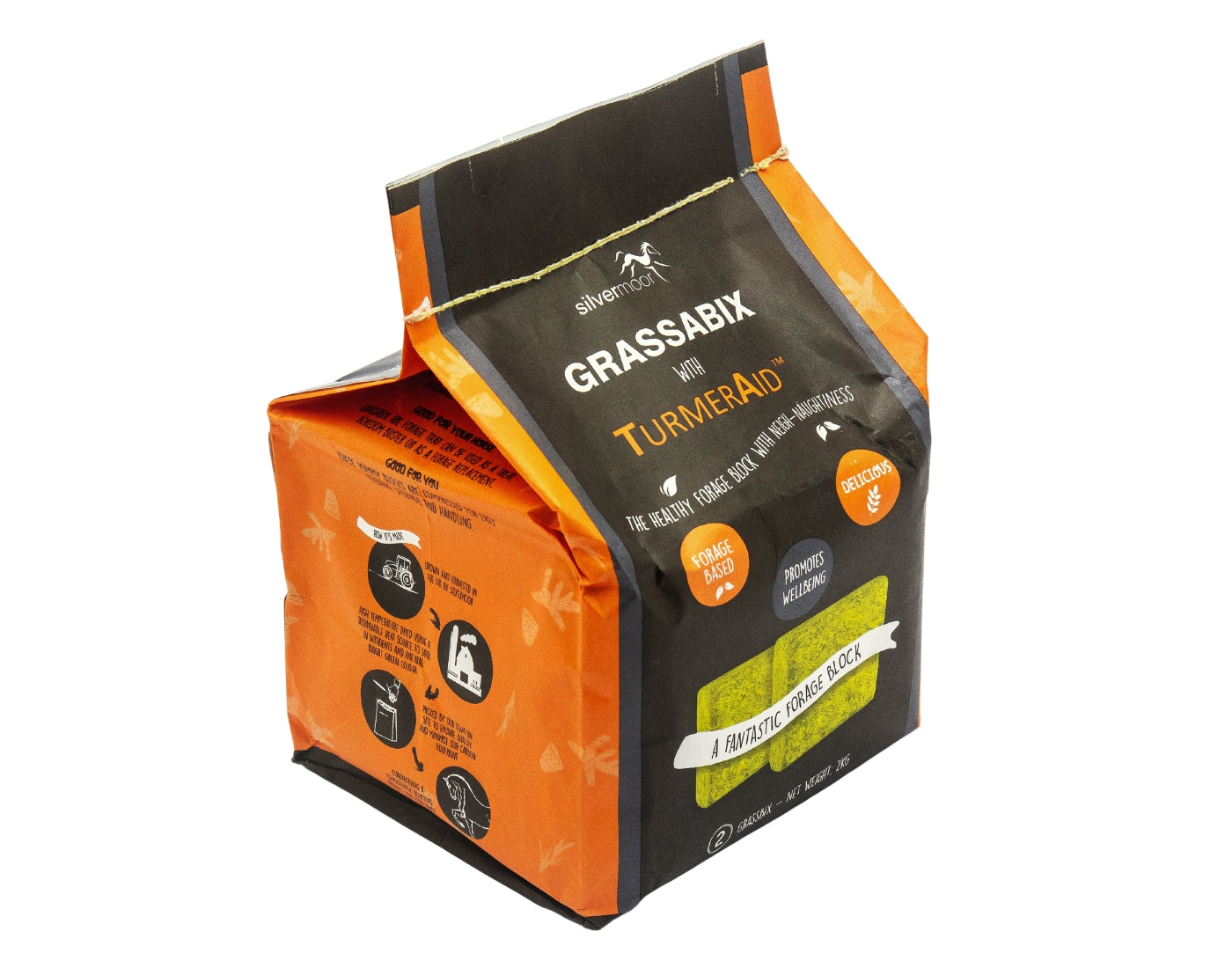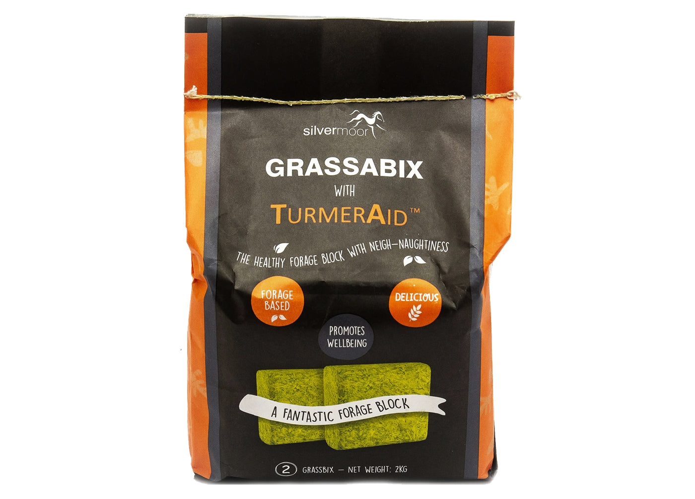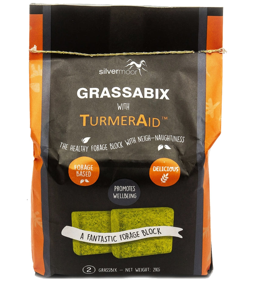 Silvermoor Grassabix are a complimentary feed for horses to be fed in conjunction with their current diet. These yummy blocks have been compressed for easy feeding, storage and handling and can be used as a treat, boredom buster or as a forage replacement. They can be fed directly from the bag, or soaked in water to create a delicious mash. This tasty treat for horses and ponies is supercharged with TurmerAid which promotes wellbeing. Specifically it supports healthy joints, aids digestion and helps maintain a healthy, shiny coat. Silvermoor Grassabix are also suitable for laminitics.