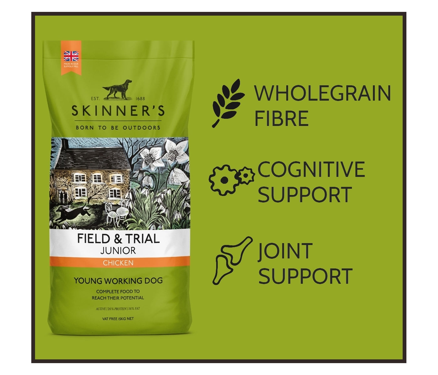 Skinner's Field & Trial Junior is a complete dry dog food, specially developed and formulated to support the continued growth and development of puppies (from approximately six months old) and young dogs. Generations of young dogs have been reared on Field & Trial Junior and it remains a firm favourite. Field & Trial Junior has been carefully formulated to ensure the correct level of key nutrients to support ongoing growth and development are provided in a highly digestible form and the kibble is of a size and shape to suit young dogs of different ages, shapes and sizes! Junior is an ideal ration for moving puppies onto, to support their growth and development to adulthood, and creates a nutritional “stepping stone” from Puppy food to Adult food. Junior can be fed from approximately six months of age (depending on breed) until maturity is reached, growth has slowed, and adult size has been reached. Skinner’s Junior can be fed straight from the bag or, if your dog prefers, moistened a few minutes before serving with a small amount of tepid water. *VAT Free*