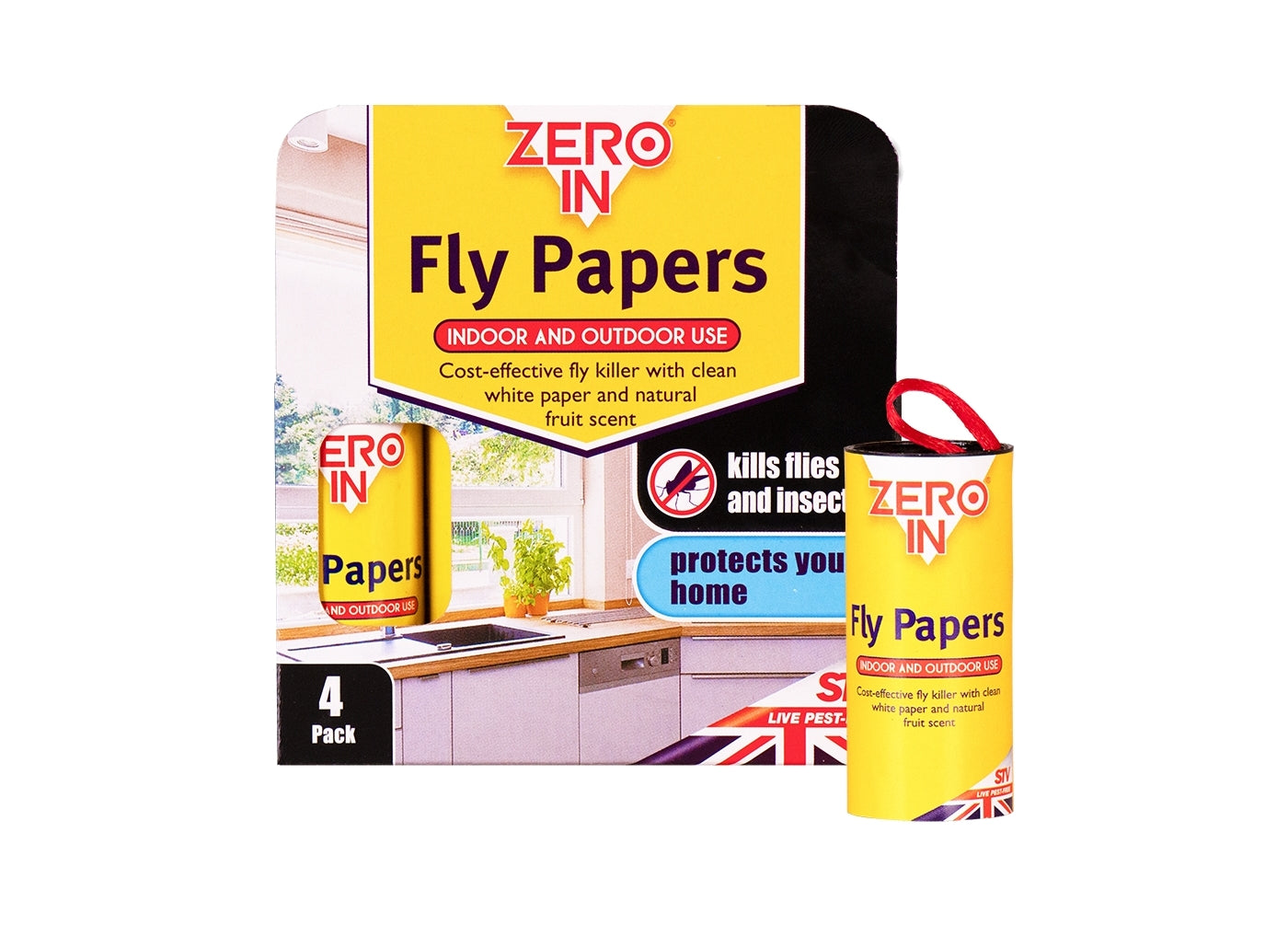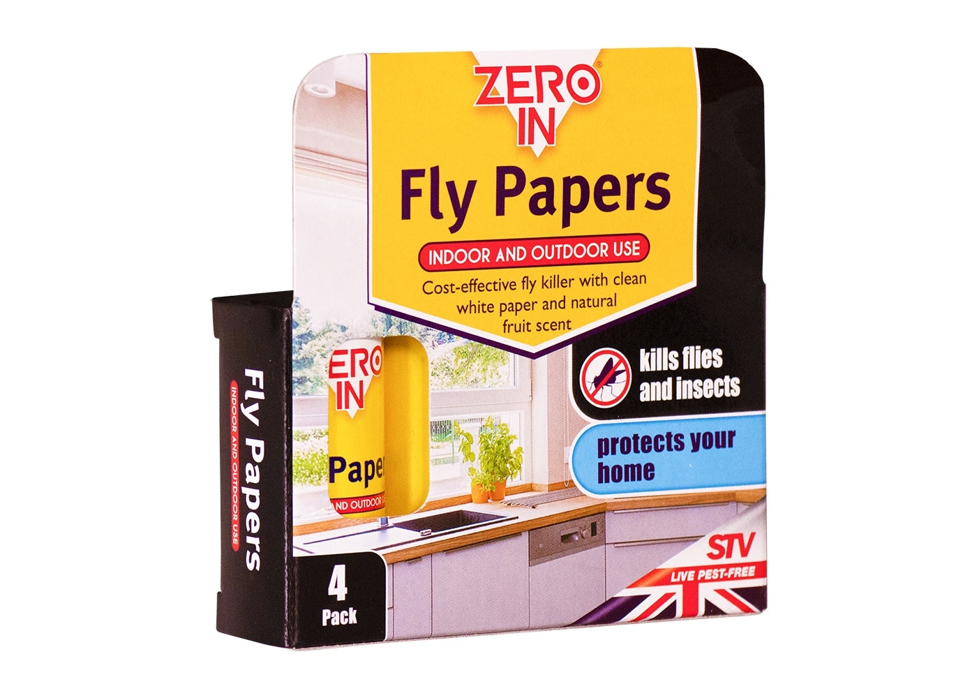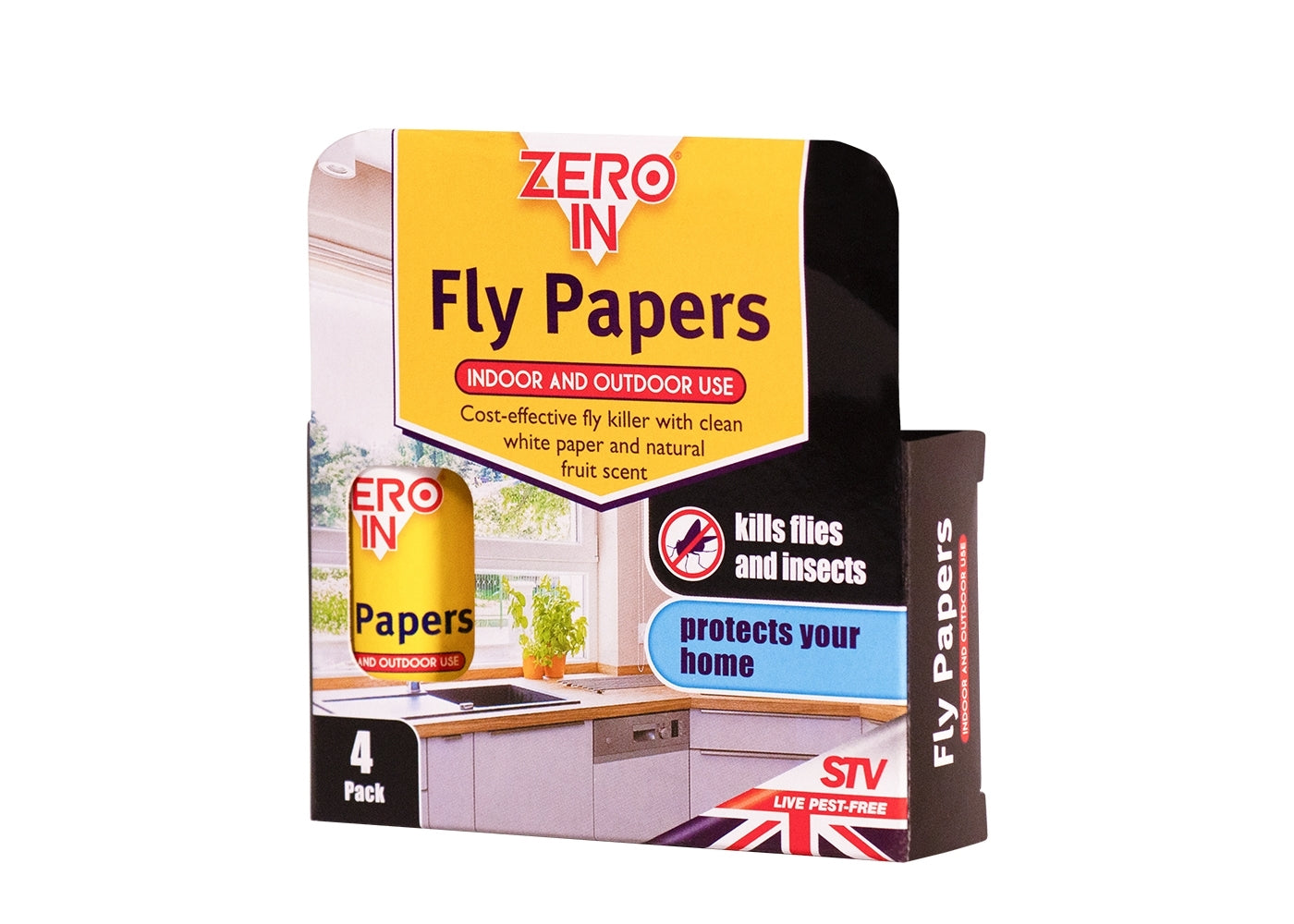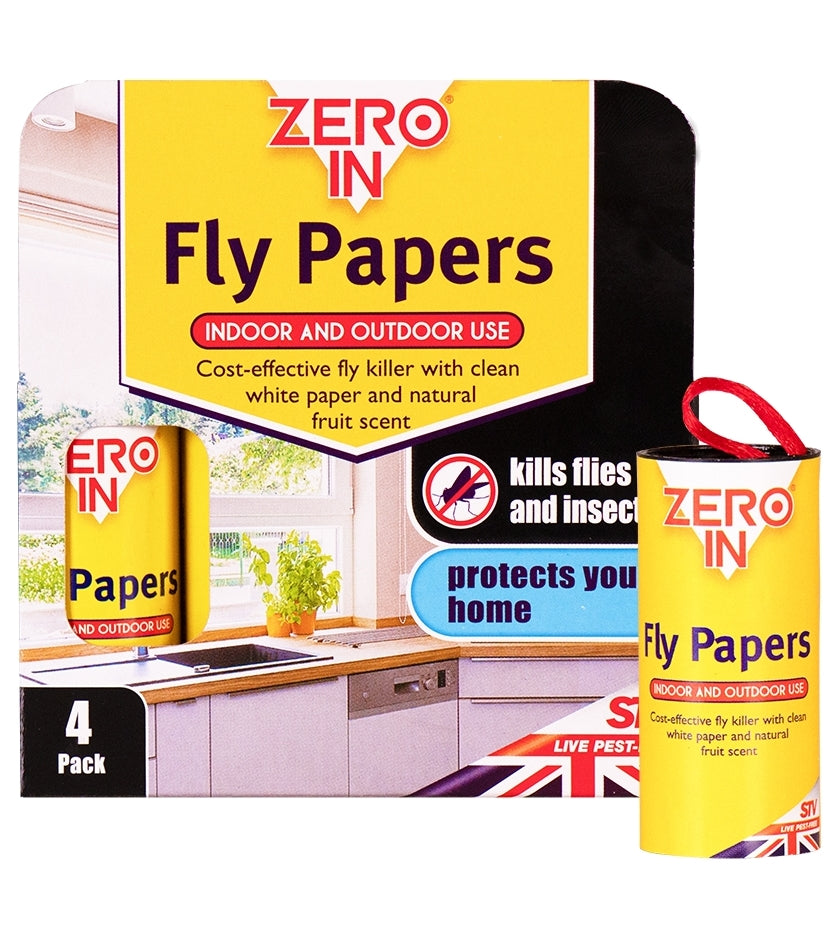 Zero In Fly Papers attract and kill flies using clean white paper containing a natural, non-toxic fruit scent which flies and other flying insects find irresistible. Zero In Fly Papers are Inexpensive, highly effective and a great way of gettting rid of unwanted flies without using poison sprays - making them safe to use around children and pets. Independent tests have also proven that Zero In Fly Papers kill over 30% more flies than other brands. They are suitable for use in out-buildings such as sheds, stables and barns as well as in the home - simply hang up in any area blighted by flies and other flying insects. Available in a pack of 4 fly papers.
